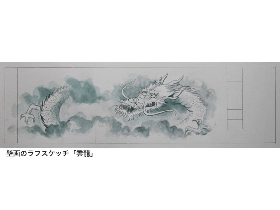 モチーフは、わかりやすくてサプライズ効果も抜群の水墨画風の「雲龍」です。テーブルレイアウトが日によって変更されるということも確認して、予め描いたラフスケッチを元に現場でアレンジしていきます。
